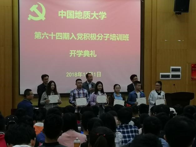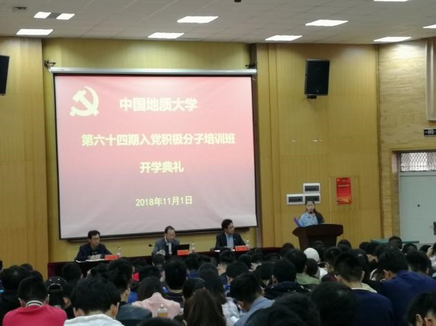 (武汉)第六十四期入党积极分子培训班开学典礼在教三109举行。校党委书记何光彩老师、组织部副部长刘治国老师、组织部朱丹老师及全体六十四期入党积极分子参加典礼。