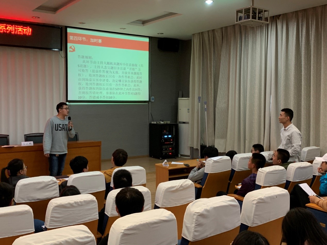决赛形式为现场答题,答题环节分为小试牛刀、风险关口、争分夺秒,按三个环节得分总和决出前三甲。为保证比赛的公正公平,本次决赛邀请了学院辅导员丁钰峰老师、买买提·艾尔肯老师、院研究生会陈霖、院学生党建办公室黄仕恒组成比赛的公正组。决赛赛场气氛激烈,各参赛队伍你追我赶、互不相让,经过前两个环节的比拼,各队成绩不分伯仲,可见选手们对相关知识学习充分、掌握牢靠。