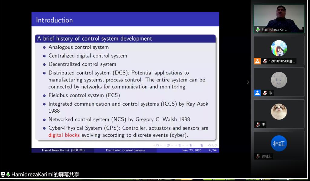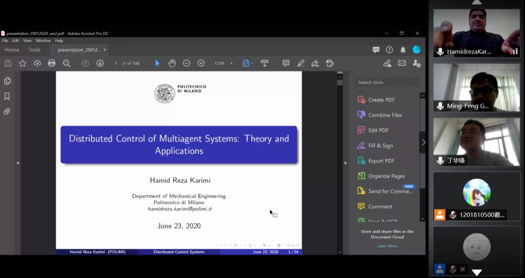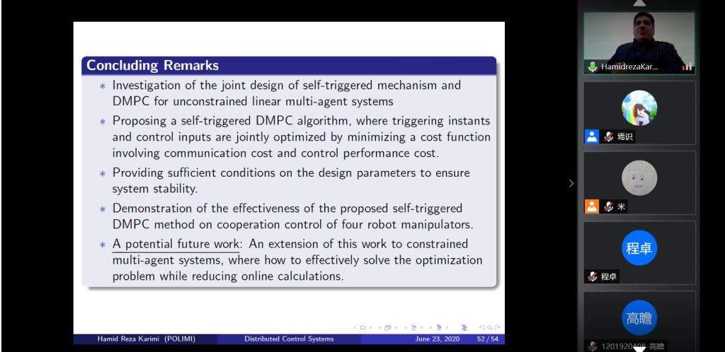 院长丁华锋教授邀请,意大利米兰理工大学Hamid Reza Karim教授于6月23日通过线上会议来我校作题为Distribute Control of Mult iagent System:Theory and Applications的学术报告。报告会由葛明峰老师主持,国产探花