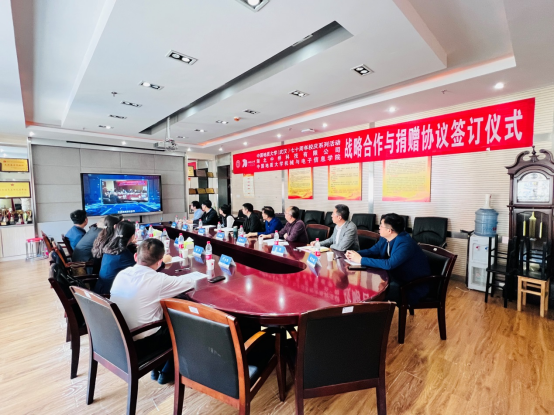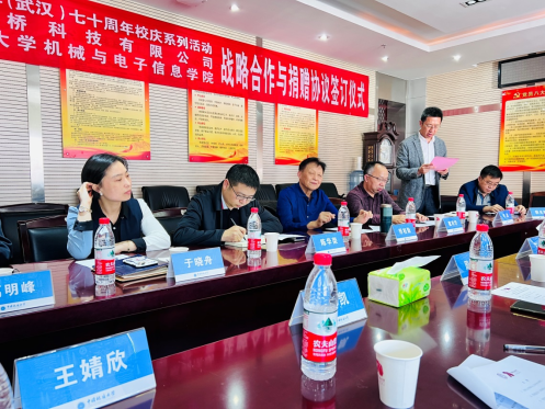 战略合作与捐赠签约仪式。湖北中桥科技有限公司总裁丁燕、董事长周强、副总经理黎米和丁小华、董事长助理王婧欣以、武汉地大矿业有限公司总经理赵凯、我校原副校长邢相勤、校友与社会合作处处长陈华荣、院党委书记瞿祥华、副院长李波、副书记于晓舟和教师代表等出席仪式,仪式由瞿祥华主持。