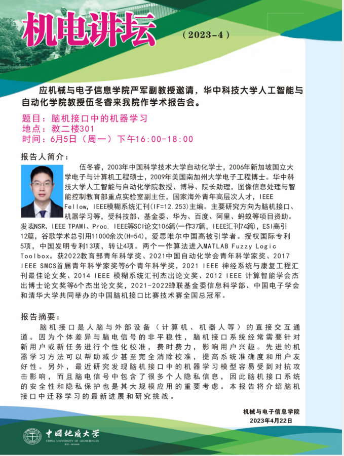 【6月5日】机电讲坛(2023-4:华中科技大学人工智能与自动化学院教授伍冬睿来国产探花 作学术报告会
