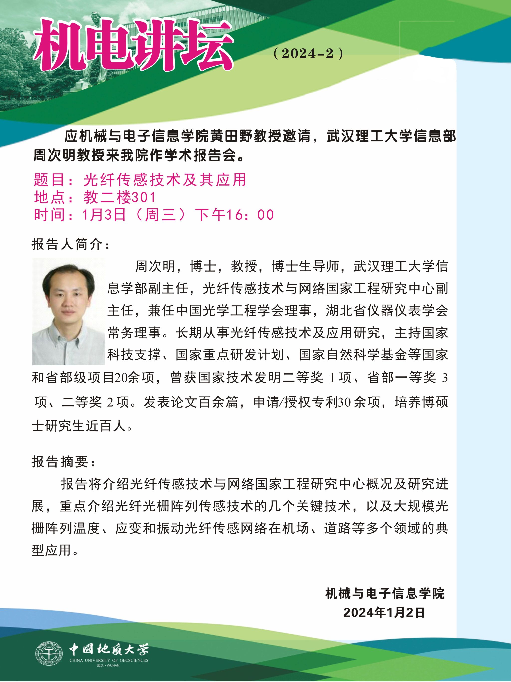 【1月3日】机电讲坛(2024-2):武汉理工大学信息部周次明教授来国产探花 作学术报告会