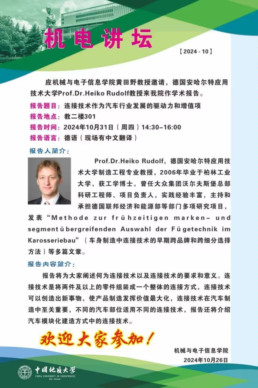 【10月31日】机电讲坛(2024-10):德国安哈尔特应用技术大学Prof.Dr.Heiko Rudolf教授来国产探花 作学术报告