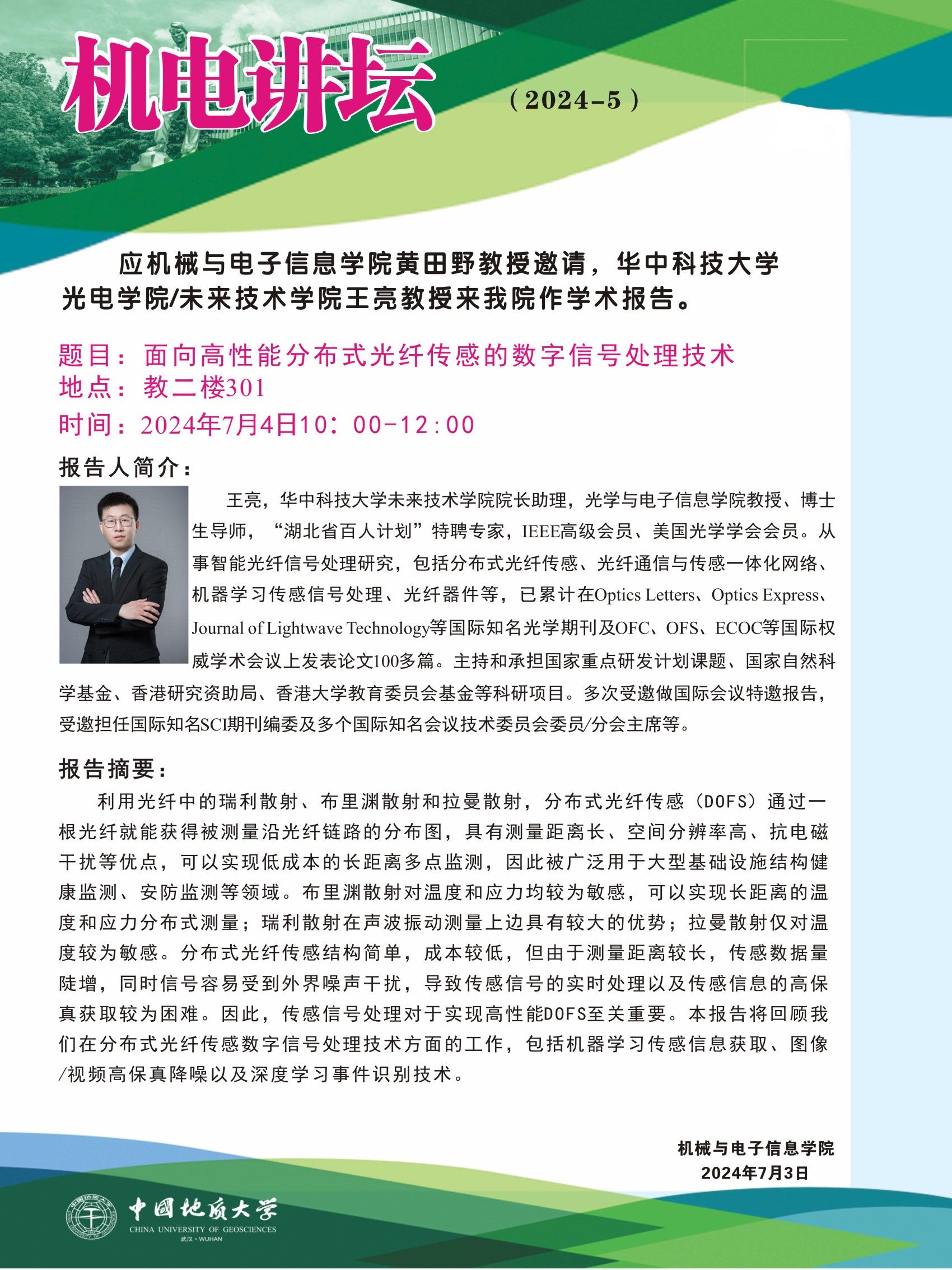 【7月4日】机电讲坛(2024-5):华中科技大学未来技术学院王亮教授来国产探花 作学术报告会