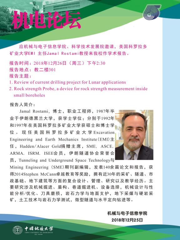 机电论坛:美国科罗拉多矿业大学Jamal Rostami教授来国产探花 作报告
