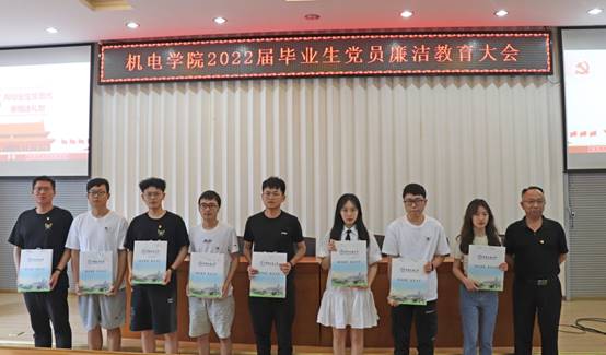 瞿祥华代表学院党委向2022届毕业生党员代表赠送毕业生党员纪念礼包。礼包以“喜迎二十大、青春心向党”为主题,由包括主题学习教材、毕业生党员专属贺卡、致2022届毕业生党员的一封信在内的5件礼物组成。礼包寄托着学院党委对毕业生党员的期许,希望他们历经沧桑而初心不改、饱经风霜而本色依旧,从党的光辉历史中持续强化理论武装,以科学的思维方式踔厉奋发向未来!