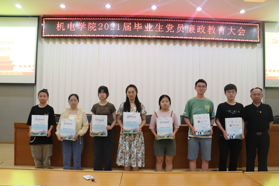 瞿祥华代表学院党委向2021届毕业生党员代表赠送毕业生党员纪念礼包。礼包以“学党史、强信念、跟党走”为主题,由包括党史主题学习教材、毕业生党员专属贺卡、致2021届毕业生党员的一封信在内的5件礼物组成。