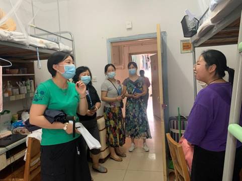 于晓舟带队前往北区学生宿舍慰问返校同学,询问同学们返校的感受,了解同学们的心理状况,并检查指导宿舍的通风和消毒情况。她强调,同学们要做好个人防护,合理安排时间,为高质量的学习效率提供保障。