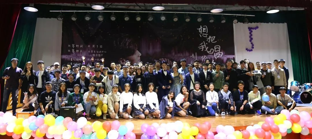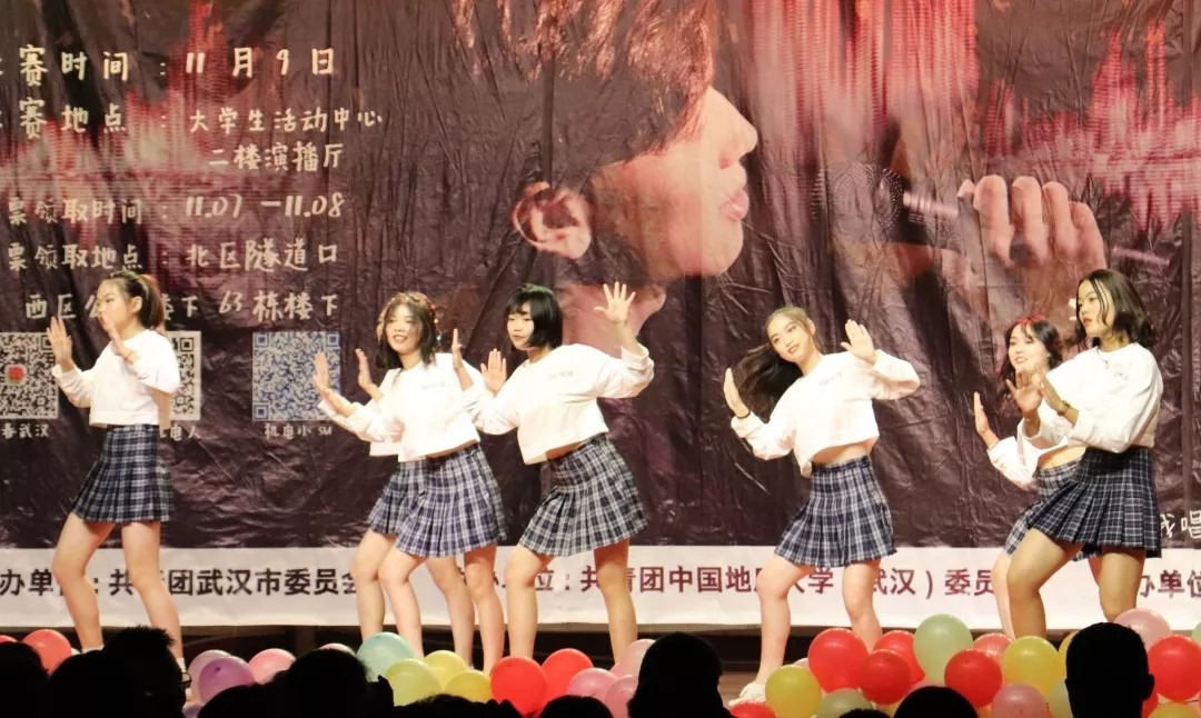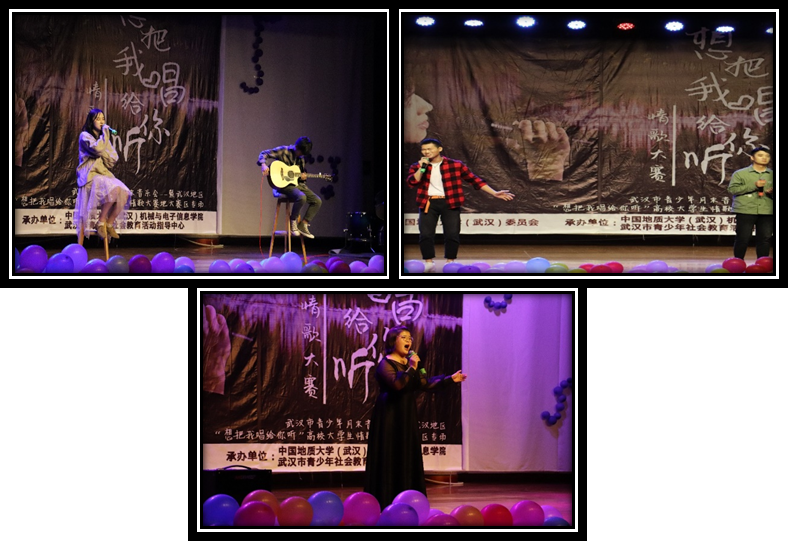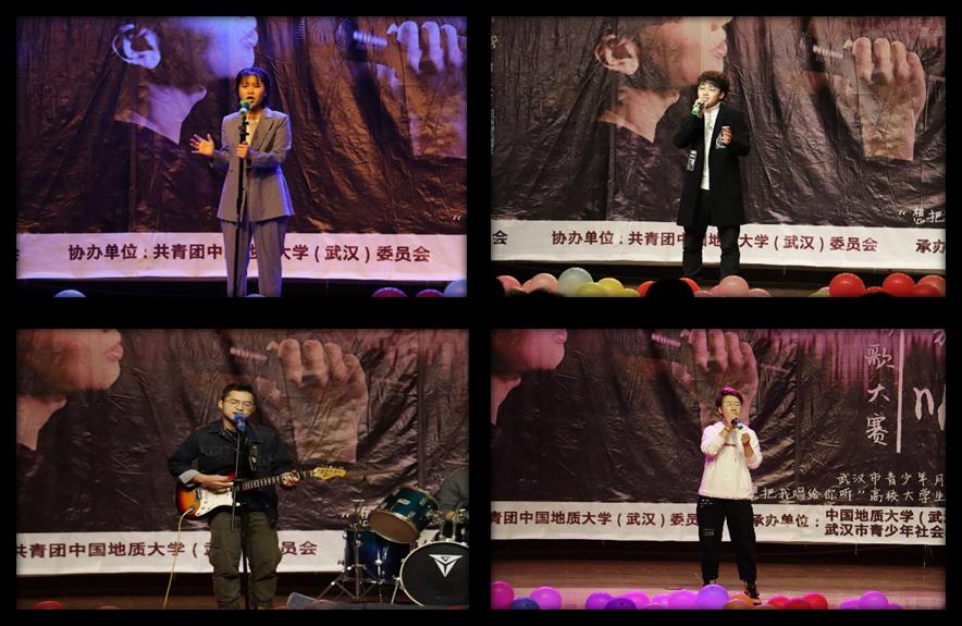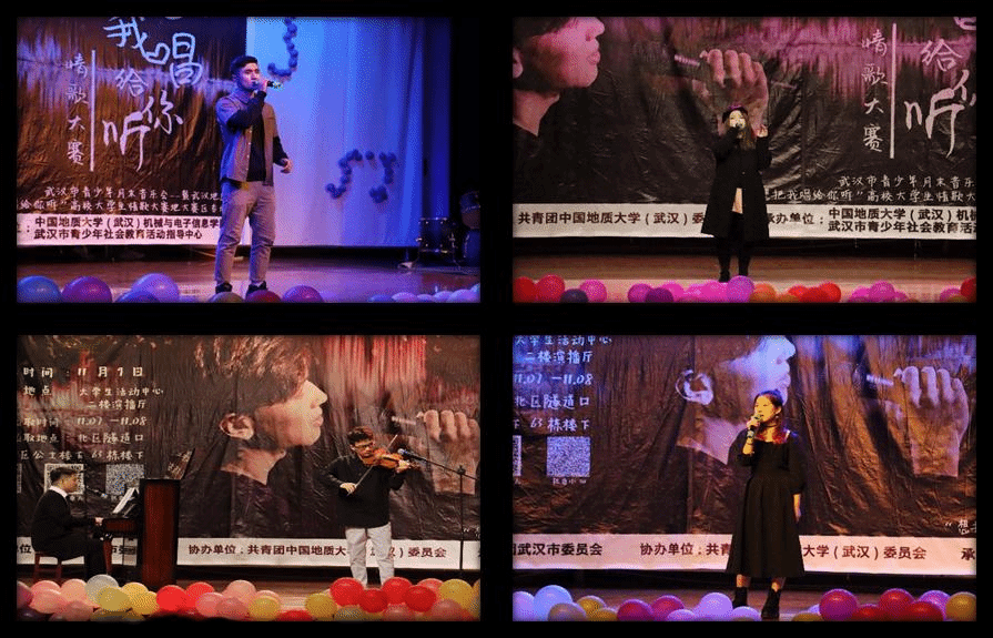 (武汉)大学生活动中心二楼演播厅,武汉市青少年月末音乐会暨武汉地区“想把我唱给你听”高校大学生情歌大赛地大赛区决赛隆重举行,来自学校不同学院的11组选手,共同唱响了地大人的绵绵情歌,献礼伟大祖国、献礼可爱青春、献礼音乐梦想。