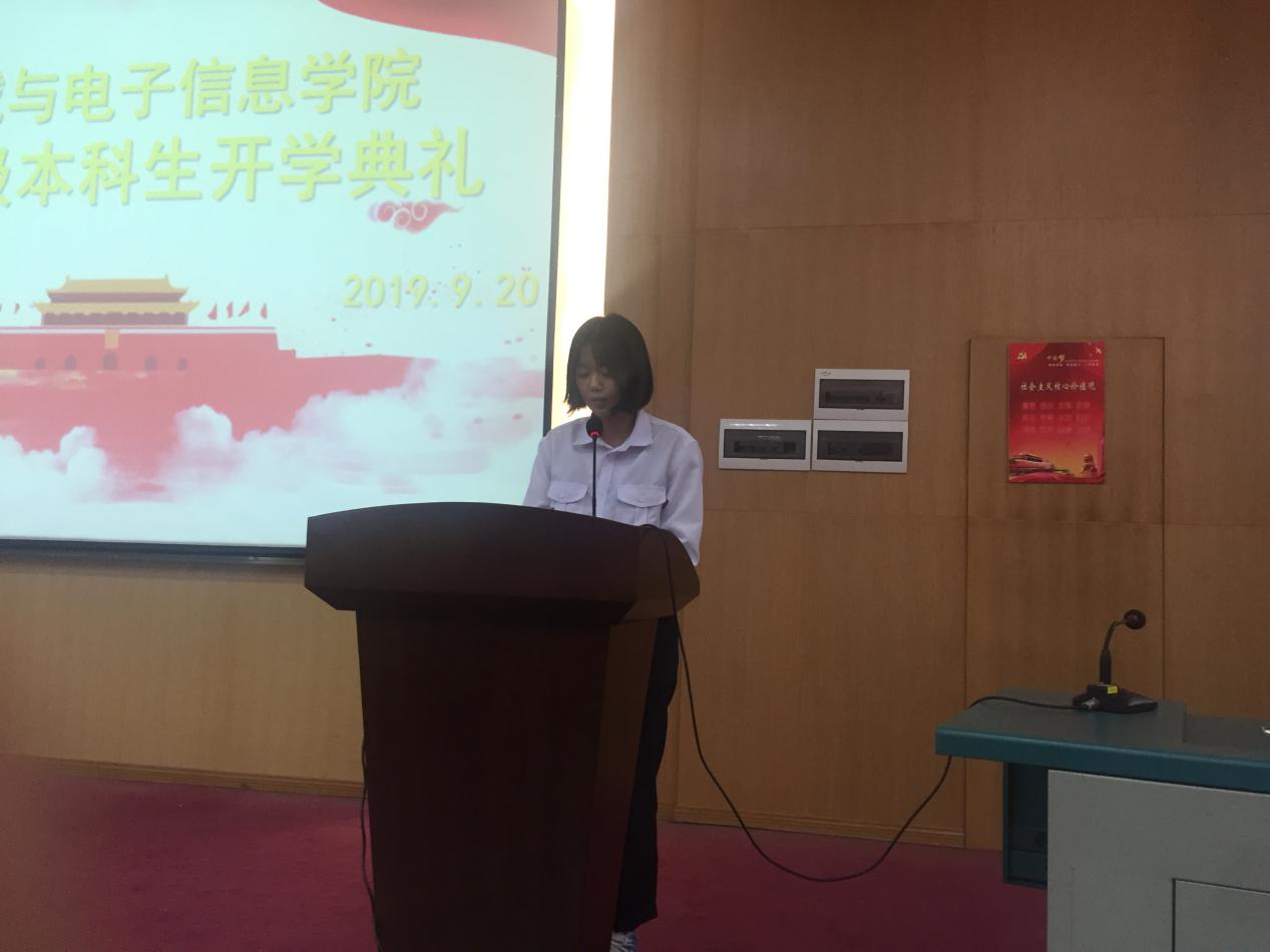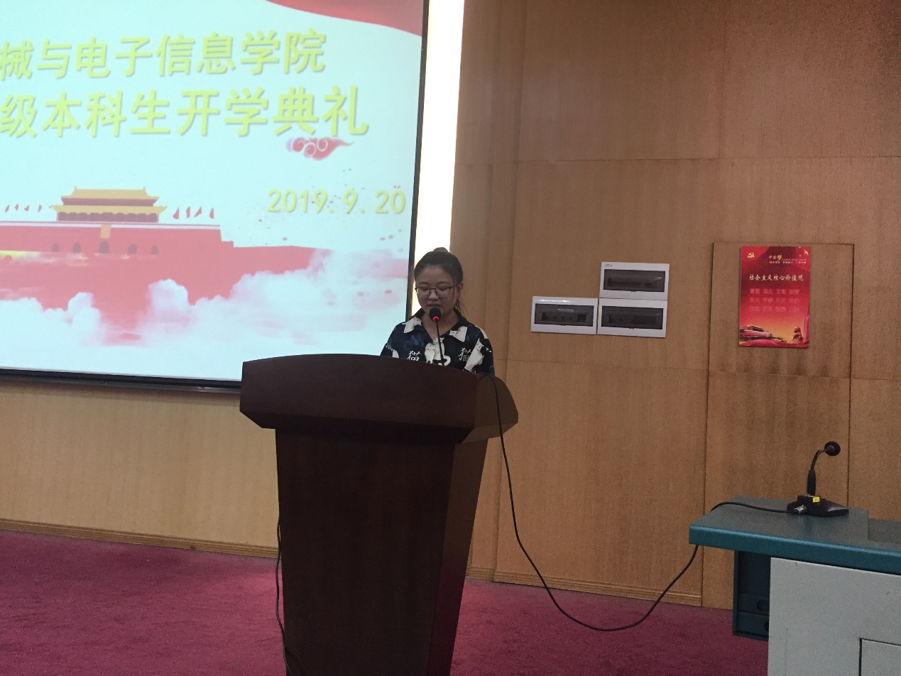 老生代表2017级电子信息专业朱倩倩同学分享了自己对大学生活的感悟。她希望学弟学妹们可以珍重梦想,胸怀远方;珍视机遇,奋力成长;珍惜韶华,不负时光。2019级新生代表07J197梁浩越同学描述了对大学生活的憧憬与向往,希望通过努力能够成长为理想中的自己。