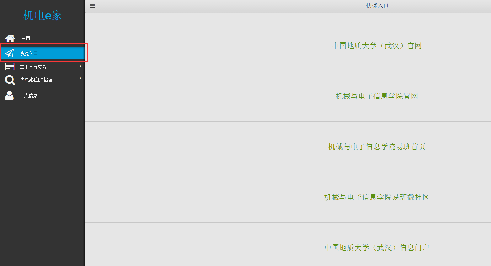 学生自主开发的自助二手闲置市场、自助失/拾物招领系统已经全面上线使用,该功能让同学们通过自己的手机客户端就能实现操作。同时,“e家”目前整合了学生常用的的资源平台,包含地大官网、信息门户、四六级成绩查询等便捷入口,实现一站式服务。