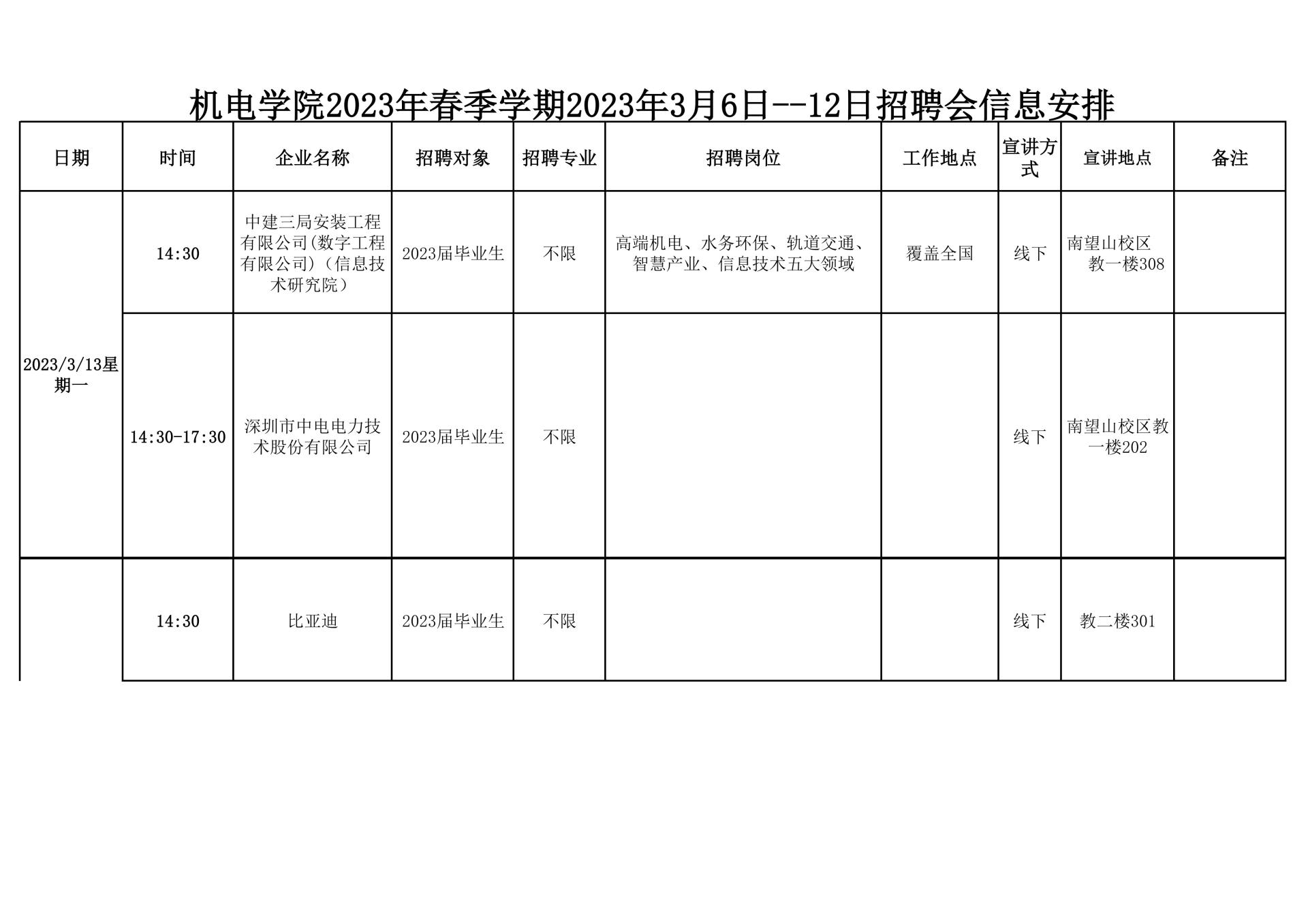 【毕业生·2023年3月13日--18日招聘会信息】国产探花 2023年春季学期2023年3月13日--18日招聘会信息安排